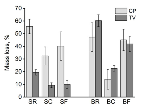 As expected, the highest average mass losses were found in the unmodified spruce and birch samples (Figure 3). The unmodified samples had turned from hard to soft and spongy. The brown rot CP caused a higher mass loss on unmodified spruce samples than the white rot TV, while TV caused a slightly higher mass loss on unmodified birch samples than CP. The difference in mass loss between the two fungi on reference samples was statistically significant only on spruce. On modified spruce samples, losses caused by TV were moderate (below 10% for SC and SF), with a 50% reduction in comparison to the unmodified samples (SR). Mass losses caused by CP were smallest for contact charred samples on both spruce and birch. The losses were 42% (SC) and 70% (BC) lower in comparison to the unmodified references of the respective wood species. The same trend was also observed for BC–TV, with a 63% (BC) lower mass loss compared to the unmodified reference. The mass losses caused by CP and TV differed significantly from each other within every modification, but within the TV-series, mass losses do not differ significantly between contact charring and flame charring modifications. On birch, only BC mass losses showed significant differences between the two fungi, i.e., there is no difference between the BR and BF treatments in terms of mass loss at a confidence level of 95%.