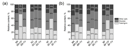 Supporting the elemental analysis results, both the undegraded spruce and birch samples showed an increasing lignin content with increasing severity of the modification (Figure 2; Table S1). The value presented is a combination of relative amounts of solid and acid soluble lignin. The relative lignin content of unmodified spruce (SR) was about 27%, that of contact charred spruce (SC) 61%, and that of flame charred spruce (SF) almost 93% (Figure 2a). During surface carbonization, birch underwent similar changes to spruce (Figure 2b). The original lignin content of about 21% increased to 50% and to 96% on BC and BF, respectively. This indicates a very heavily carbonized surface on BF. The amount of holocellulose was higher on BC than on SC (about 50 % to 39%, respectively), which shows that spruce was slightly further pyrolyzed within this regime. The samples taken from 2 mm beneath the surface showed a slightly higher content of cellulose and lignin on SC/BC in comparison to SF/BF, revealing the extent of the thermally modified transition zone that continues deeper beneath the surface on contact charred than flame charred samples. The references were practically identical at 0 and 2 mm depth from the surface and very similar to both SF and BF at 2 mm depth. The results for total lignin content are in line with the elemental analysis results. In an unmodified wood sample, the carbon is mostly found in lignin and carbohydrates. As the relative amount of carbohydrates decreases due to the thermal degradation process, the share of lignin increases. In pyrolysis, lignin preferentially forms char [23,24]. Additionally, other lignin-like aromatic compounds are formed, further increasing the relative lignin content.