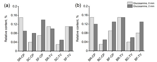 Relative content of glucosamine from the surface (0 mm) and 2 mm beneath the surface in (a) spruce and (b) birch samples exposed to C. puteana (CP) and T. versicolor (TV). Values are averages of duplicate analyses on pooled samples. R = unmodified; C = contact charred; F = flame charred; S = spruce; B = birch.