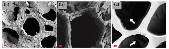 Modified layer cross-sections of (a) BC–TV; (b) SC-CP; (c) SF–CP with arrows pointing to faintly visible hyphae of C. puteana inside the lumens. Imaged at 2000×, bar = 2 µm.