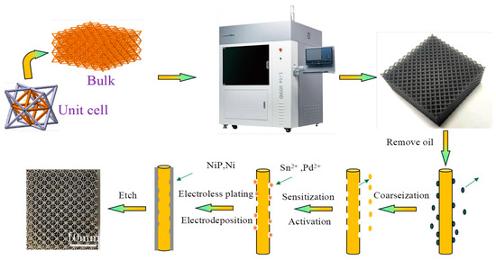To obtain a conductive surface that can be used for electroless Ni plating, the sample was first immersed in an aqueous sodium phosphate solution to remove the oil stain on the surface of the polymer resin, and chromium trioxide solution was used for coarseization. Then it was immersed in a solution containing hydrochloric acid and stannous chloride for sensitization. The template was then immersed in the activator solution to deposit a palladium catalyst using sodium sub-phosphate solution to disperse the colloidal palladium on the polymer template for the purpose of exposing palladium particles as a catalyst. Finally, the sample was immersed in the electroless nickel plating solution, the electroless plating solution used nickel sulfate as the nickel source, sodium hypophosphite as the reducing agent, sodium citrate and ammonium chloride as the complexing agent, and the pH of the electroless nickel plating solution was maintained between 9–10 by adding ammonia at 50 °C. Electroless nickel plating for 30 min was sufficient to deposit a conductive metal layer on the template surface, after which different densities of Octet lattices can be obtained by controlling the electrodeposition time (Figure 1).