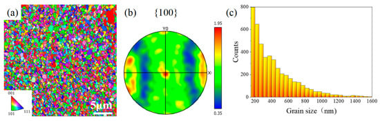 An electron backscatter diffraction test was performed cross-sectionally on the lattice sample along the thin film deposition direction. Figure 3a,b show the lattice grain orientation distribution and the pole figure, and a relatively concentrated (001) directional texture can be seen. Small, isoaxial grains in the nanometer scale could be observed in Figure 3a, and the grain distribution was widespread. Figure 3c shows the relationship between the size and the number of Ni grains. These grains were mainly concentrated between 150 and 500 nm, accounting for ~75% of the total grain count, with an average grain size of 429 nm.