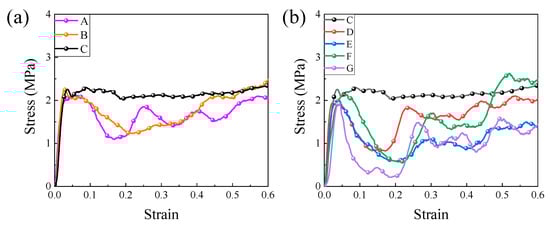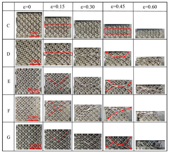 It can be found that the difference between the stress plateau region and fluctuation region in the hollow lattice curve was caused by the difference in the length-to-diameter ratio of the rod. As the amount of compression deformation gradually increased, the stress–strain curve of the lattice with a large length-to-diameter ratio (e.g., lattice A, E, F and G) was jagged, and yield and plastic deformation occurred when the lattice sample reached peak stress. The stress began to decrease until the first stress underestimation appeared, after which even secondary and tertiary stress rose and fell. Lattices with small length-to-diameter ratios (such as lattice C) had interesting deformation behavior that differed from other lattices, where the lattice reached the stress peak and then a slight decrease, followed by a longer stress plateau region. In the stress plateau phase, the strain gradually increased, but the stress remained basically unchanged. Its compression curve was basically similar to that of typical elastoplastic foam materials.