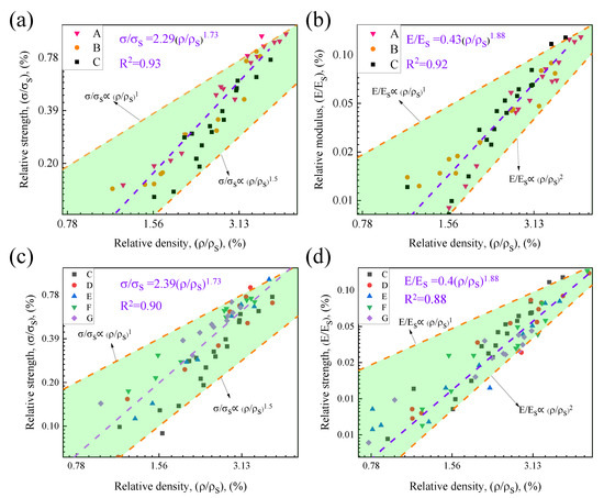 Comparisons were made with the Gibson–Ashby theoretical model to quantify the structural efficiency of Octet hollow lattice samples in this study. Figure 8 shows the relationship between the relative strength and relative density of the Octet lattice for different structural parameters. The strength and modulus of all lattices gradually increased as the density increased. According to the regularity of the data, the exponential relationship can be used to describe the relationship between the relative strength, relative modulus and density of the lattice Ni. Lattices of different rod lengths and rod diameters have substantially comparable strengths and elastic modulus at essentially the same density. The fitting relationships between relative strength, relative modulus and density were σ/σs = K(ρ/ρs)1.73 and E/Es = C(ρ/ρs)1.88, respectively; all the strength and modulus of lattices of different rod lengths and diameters basically fluctuated around these two curves. The coefficients K and C were generally related to the material configuration. By comparing the mechanical properties and deformation process of different structural parameters of the Octet lattice, it can be found that changing the structure parameters of the Octet hollow lattice changed the deformation characteristics and failure mode of the lattice, but the strength and elastic modulus of the different structural parameters for the Octet hollow lattice did not change substantially [14,21,34,44].