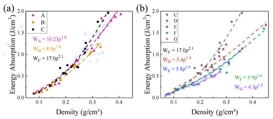 Figure 9 shows the change in energy absorption capacity of seven groups of lattice samples with density, and WA–WG represented the energy absorption capacity of A–G lattice samples. As can be seen from the Figure 9, the energy absorption capacity increased with density because the rod area under load increased. The lattice energy absorption capacity and density can also be in line with the exponential relationship. The energy absorption capacity gap was small between three groups, A, B and C samples at low density. However, when the density exceeded 0.2 g/cm3, the energy absorption of lattice C exceeded A and B. The five groups of different lengths have a clear trend; that was, the energy absorbed by the lattice energy decreases with the increase in length. This showed that reducing the length-to-diameter ratio of the hollow lattice was conducive to improving the energy absorption per unit volume. For example, at a density of about 0.28 g/cm3, the energy absorption capacity of sample C was 23% and 45% higher than that of sample B and sample G, respectively. By designing the structure of the Octet hollow truss structure, an ideal energy-absorbing structure can be obtained.