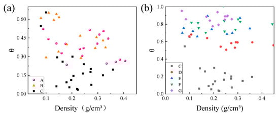 Figure 10 shows the volatility of different lattice compression curves at different densities. From the figure, it can be found that the value of θ tended to increase with the increase in the lattice length-to-diameter ratio because lattices with a large length-to-diameter ratio were prone to unstable deformation and fracture. The θ of the lattice of C, D, E, F and G five groups remained basically equivalent over a large strain density range, such as the θ value of lattice F is basically equal to 0.8. This lattice collapsed by essentially the same amount after reaching stress peaks at different densities. Moreover, this further caused the energy absorption capacity of the lattice to be lower than that of the small length-diameter ratio. The lattice with a small length-diameter ratio has a longer stress plateau region, which enables the lattice material to have the characteristics of high energy absorption, and it can dissipate the external impact energy through the deformation, collapse, fracture and cell wall friction of the lattice pore.