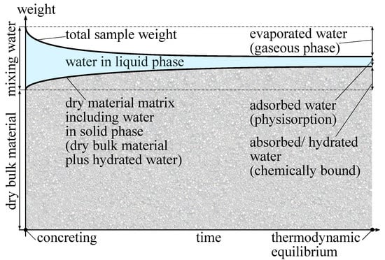 Figure 1 shows a schematic sketch of the evolution of water and its different states of matter during the hydration process. In the beginning, the dry bulk material in solid state and the mixing water in liquid state are separated. In this sketch, all quantities are given in weight. The sum of the initial weight of dry bulk material and mixing water gives the maximum reachable weight of the hydrated sample. During concreting, both are mixed together, and the hydration starts immediately [
