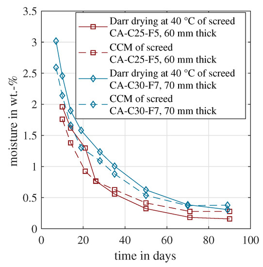 was reached when the difference in mass on three consecutive weighings (with at least 24 h in between) did not change more than 0.1% of the total mass. The average drying time for the CT screed was 21 to 22 days at 40 °C and 7 to 8 days at 105 °C. The CA screed dried after 6 to 7 days at 40 °C.