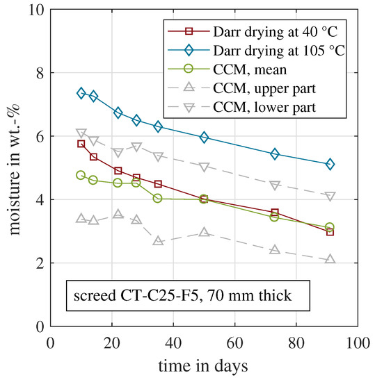 Figure 4 depicts the resulting moisture content for all four approaches for CT-C25-F5. The Darr drying was done at 40 °C or 105 °C, respectively. The drying temperature of 105 °C yielded significantly higher material moisture values. The deviation between both was between 1.6 wt.-% and 2.1 wt.-%. This clearly indicated that with the 105 °C drying temperature the amount of physiosorbed (evaporable) water could not be correctly determined. The solid cement structure was partly damaged and chemically bound water was released and evaporated. The sample weight decreased, which was incorrectly recognised as a higher material moisture. In consequence, the 105 °C data were not considered in further analyses. In addition, the two CCM measurements from the upper and lower part are shown. The upper part, which includes the top surface where the evaporation takes place, shows lower moisture values compared to the lower part. Furthermore, the moisture was significantly below the one recorded for the Darr drying at 40 °C. The main reason was the moisture gradient within the sample. Comparable measurements were carried out with cement-based screed samples with a thickness of 70 mm [