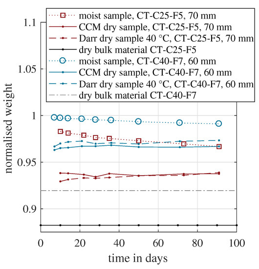 Figure 7 presents the same approach for the two cement-based materials. Because these two mixtures had a different water demand, the lower limit expressed by the dry bulk material weight varied. As expected, the normalised weight of the moist samples decreased with time due to water evaporation. For the CT-C40-F7 sample, the Darr dried samples weight was above the CCM value during all measurement days. In the case of CT-C25-F5, the trend was the opposite, except for the last measurement point on day 90.