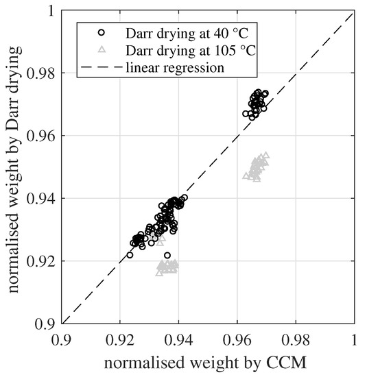 The slope coefficient s was calculated based on all 102 sampling points of the normalized dry weight. Here, only the Darr drying values at 40 °C were included, which led to . The corresponding coefficient of determination was . The slope value was very close to one and around 96% of the variance of the data could be explained by this simple linear regression model. This confirmed the high agreement between Darr drying at 40 °C and the CCM for determining the DoH. On the other hand, the Darr values at 105 °C showed a systematic negative bias of around two percentage points. Once again, this validates that such a high drying temperature is able to extract chemisorbed water from the investigated material samples. Furthermore, looking on the residuals of the regression, there was no indication that the different sample thicknesses had any influence on the determination of the DoH.