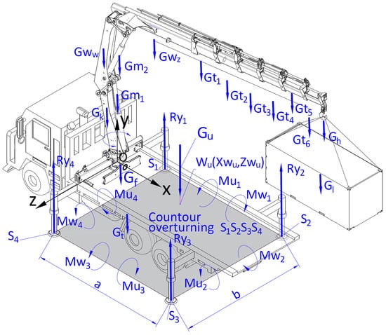 - The location coordinates of the centre of gravity (, , ) = of the cargo handling system. If the line of the action of the resultant of vertical pressure forces passes through point on the plane of the surface, defined by the coordinates and located inside the tipping contour , the crane is resting on all the outriggers in points , , and ;