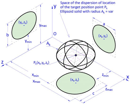 Geometrical interpretation of the indicator is presented in Figure 4. It is a radius of an ellipsoid described on a cuboid whose sides are parallel to the axis of an absolute coordinates system describing the location of the target point after completing the cargo handling task.