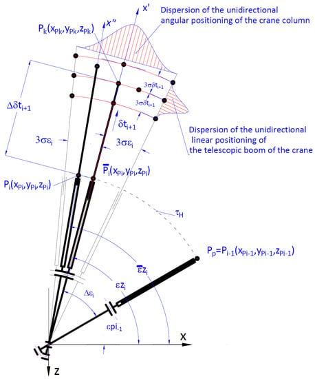 - Defined value of the error of unidirectional linear positioning of a slide movement of a multi-member telescopic boom of the crane, in relation to the expected value determined by the dependency (17):where: —unidirectional accuracy of the estimation of placing the cargo in the intermediate position by the crane operator, expressed as (18):—error of the accuracy of linear positioning resulting from the reaction time of an operator controlling the movement of the crane, and linear velocity of the telescopic boom, determined as (19):—coefficient of estimating the accuracy of unidirectional linear positioning of the slide , depending on the position of the crane operator, expressed as (20):, , —geometrical parameters depending on the position of the crane operator —Figure 6b;—coefficient of the visual perception of an operator, defining his ability to correctly estimate unidirectional linear displacement of working members of the crane;—mass coefficient of the accuracy of unidirectional linear positioning of the rotation angle (the speed of the linear displacement is reversely proportional to the mass of the handled cargo).