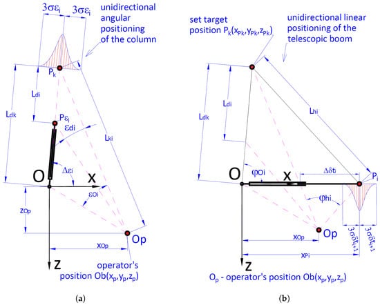 Figure 6. Parametrical sketch for determining the accuracy of unidirectional positioning of the cargo handling crane depending on an operator’s position (,). (a) unidirectional angular positioning of the crane column. (b) unidirectional linear positioning of a telescopic boom.—coefficient of the visual perception of an operator, defining his ability to correctly estimate unidirectional angular displacement of the crane’s working member,—mass coefficient of the accuracy of positioning of the rotation angle (the speed of the angular displacement is reversely proportional to the mass of the handled cargo). - (B)