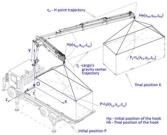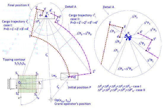 In the presented example, for a cargo handling task shown in Figure 9, the configuration of the working movements of the crane during the realization of this task is listed in Table 1, where the notations of the position parameters have been assumed in compliance with Figure 8. Cargo weighing = 800 kg located in the initial position P was supposed to be carried to the final position located in the point.