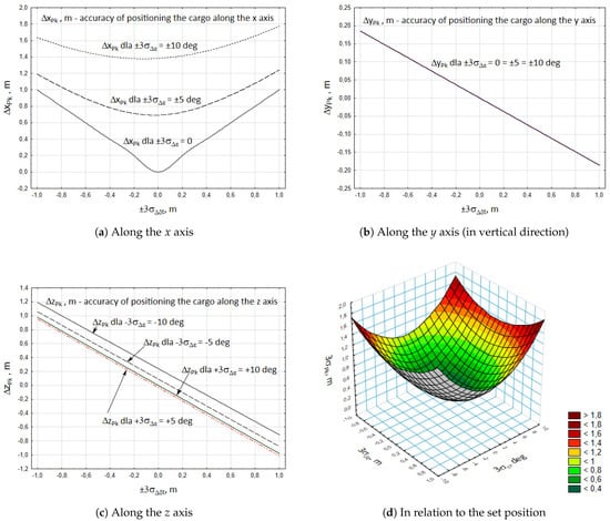 Figure 10 presents the values specifying the dispersion of the inaccuracy of positioning the cargo along the particular axes of the absolute system of coordinates of the crane. It also shows the summary dispersion of the cargo positioning in relation to the set target position.