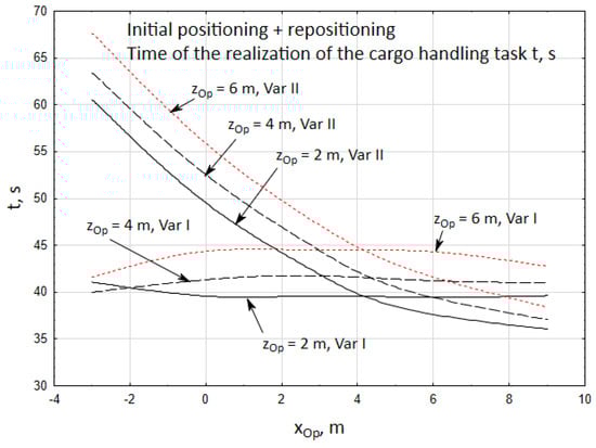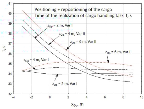 At the same time it was observed that the time of the realization of the cargo handling task in the first case only slightly depends on the position of the operator and it falls within a narrow time frame of t = 39 ÷ 44 s (Figure 17). However, in the second case it is much longer when the crane operator is = −3 ÷ 2.5 m away from the crane. Extending the time of unloading the cargo results from the high inaccuracy of unidirectional positioning of the telescopic boom moving to a significant distance with the velocity of = 0.1 m/s.