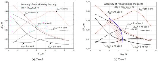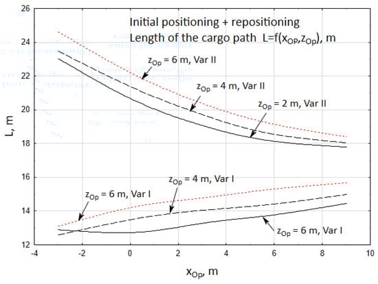 In the second case, the length of the cargo way fell within the range of L = 17.8 ÷ 24.6 m, so it is much longer than in case I. Hence, case I is the optimum solution. In this case, the accuracy of repositioning the cargo is approximate in both variants, while the time of the cargo handling task realization is generally shorter when the crane operator is closer to the vehicle. At the same time, independently of the operator’s position, the length of the way L of the carried cargo is significantly shorter in the first case.