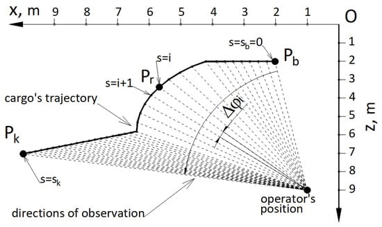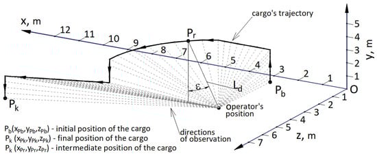 The authors developed an indicator of the accuracy of positioning depending on the position (, , ) of the operator or the video camera and the cargo movement trajectory; in the domain of the discrete values the indicator depends on the coordinates of points P(x, y, z) describing the subsequent location of the centre (base) of the cargo. In the initial position, the coordinates of the centre of the cargo are: (, , ), in the final position they are: (, , ), while in the intermediate positions they are: (, , ). The indicator depends on three factors: