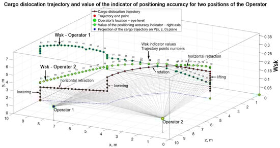 The values of the positioning accuracy indicator change along the trajectory for a constant location of the operator (, , )—a video camera. The positioning accuracy indicators assume the values within the <0,1> range, which are reversely proportional to the increase of the distance between the operator and temporary location of cargo (, , ) and to the increase of the observation angle . A decrease of the indicator is also reversely proportional for the decreasing velocities of changes of the observation angle at the constant cargo movement velocity and, particularly, when the cargo approaches the operator and also in a situation when the observation angle remains unchanged.