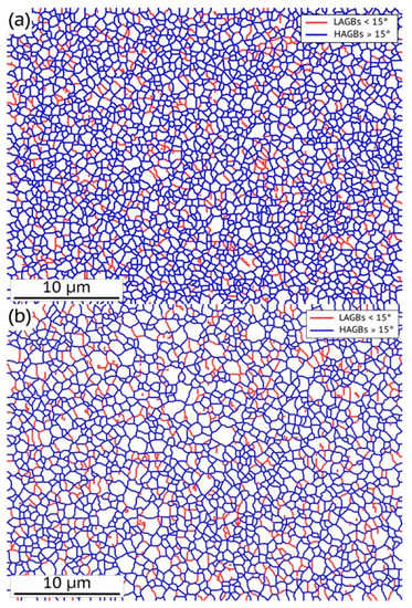 HAGBs (blue lines) and LAGBs (red lines) manifestation in the microstructure of the Al–0.4Zr alloy subjected to HPT (a) and to subsequent annealing (b).