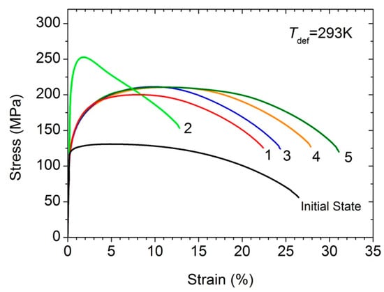 The stress–strain curves for the Al–0.4Zr alloy in the initial state, after HPT-processing (curve 1), after HPT-processing and subsequent annealing at 503 K for 1 h (curve 2), after HPT-processing, subsequent annealing, and additional HPT deformation to 0.25 (curve 3), 0.5 (curve 4), and 0.75 revolutions (curve 5).