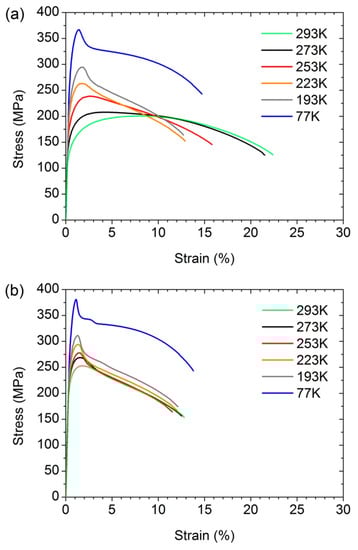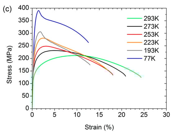 For uniaxial tension tests, blade-shaped samples with a working region of (6 × 2) mm2 were cut from the obtained discs using an electrical discharge machine []. Uniaxial tension was performed using a Shimadzu AG-XD Plus test machine at various temperatures Tdef in the range from 77 (in liquid nitrogen) to 293 K in a chamber cooled by liquid nitrogen vapor. The values of Tdef were fixed with accuracy of ±0.5 K. The strain rate was 5 × 10−4 s−1. At least three samples were tested for each state and each test temperature. Using the measured stress–strain diagrams, the conventional yield stress (σ0.2) (the stress corresponding to a relative elongation of 0.2%), the ultimate tensile strength (σUTS), the elongation to failure (δ), and the uniform elongation (δ1) were determined. A strain rate jump experiment was performed with the strain rate change from 5 × 10−4 s−1 to 1 × 10−3 s−1 and vice versa.