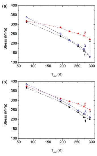 It is noteworthy that in the HPT + AN state, both the values of δ and of δ1 are practically independent of Tdef in the temperature range of 193–293 K (the range, where the AIH and DIS effects are preserved) and remain at the level of ≤1%, i.e., the samples show almost brittle behavior. Similar behavior was also observed for HPT-processed CP Al after annealing at TAN = 423 K, corresponding to the peak AIH effect in this material [].