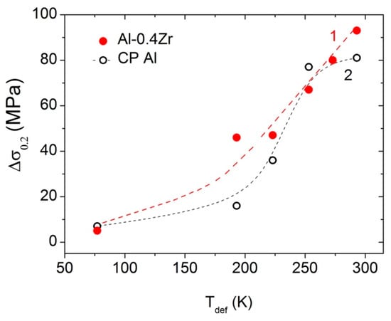 The ultimate tensile strength and the yield stress increase, while the uniform deformation and the total ductility decrease with decreasing Tdef in all of the the states under study (Figure 5, Table 2). In the UFG Al–0.4Zr alloy, the AIH effect recedes with decreasing temperature slower than in the UFG CP Al [] (Figure 6). In the UFG CP Al, the AIH effect already disappears at Tdef = 193 K, while in the UFG Al–0.4Zr alloy, it is still significant and gives Δσ0.2 ≈ 46 MPa (20%) at this deformation temperature. Since the main microstructural changes during annealing are a decrease in the dislocation density in GBs and nearby regions ([,], Table 1) and the formation of Al3Zr nanoprecipitates in some GBs [], one can conclude that the presence of alloying Zr atoms and Al3Zr precipitates in GBs in the alloy leads to the expansion of the AIH effect not only towards higher temperatures up to 553 K [], but also towards low temperatures, at least up to 193 K (Figure 5).