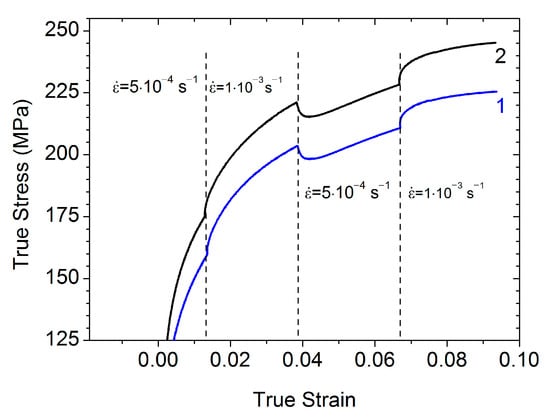 Strain-rate jump test at the base strain rate of 5 × 10−4 s−1 for Al–0.4Zr alloy samples in HPT (curve 1) and HPT + AN + 0.25 HPT (curve 2) states.