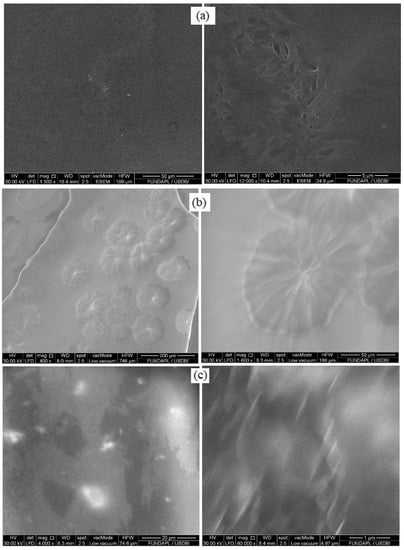 To study the crystallization of 7PMMA/3PEG and 3PMMA/7PEG polymer blends (with/without ZnO NPs), it was important to monitor their spherulitic and crystalline morphology. PEG crystallization into spherulites was studied by SEM-EDX. The 7PMMA/3PEG blend showed PEG dispersion in the PMMA matrix like sea island, with some PEG aggregates (Figure 1a). The polymer blends without ZnO NPs displayed phase separation, especially the PEG-rich blend (Figure 1b) [31,32]. In the 3PMMA/7PEG sample, PEG had a spherulitic morphology and was dispersed in the PMMA matrix, although PMMA is a minor phase and remains the dispersing phase. This is similar to what was reported by [31], and can be explained by PEG’s high crystalline nature compared with the amorphous nature of PMMA.