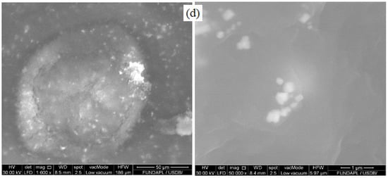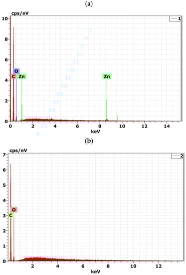 Addition of ZnO NPs to the 7PMMA/3PEG blend led to a needle-like aggregate morphology of ZnO NPs with a diameter between 100 and 250 nm and an aspect ratio (l/d) of 5–10 (Figure 1c). When PEG was the major phase (3PMMA/7PEG/ZnO), ZnO NPs limited the formation of ordered PEG spherulites (Figure 1d). ZnO NPs were more likely to be dispersed in the PEG than in the PMMA phase, adding ZnO NPs decrease the PEG spherulite mean diameter by ~20% (Figure 1b,d). The developed ZnO NP morphology was sphere-like and the mean particle size was 80 nm. The different ZnO NPs morphologies in the two blends are mainly explained by how ZnO NPs were incorporated during solution preparation. For the 7PMMA/3PEG/ZnO blend, after ZnO NP addition to the dispersed PEG phase, the mixture was incorporated into the PMMA solution. For 3PMMA/7PEG/ZnO, after ZnO NP addition to the PMMA solution, the mixture was incorporated into the PEG solution. In the 7PMMA/3PEG/ZnO sample, ZnO NPs grafting to the PEG phase might have led to ZnO NP clustering into the needle-like morphology. Then, ZnO NP dispersion in the PEG/PMMA samples was investigated by SEM-EDX (Figure 2 and Table 2).