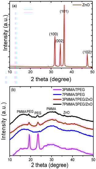 XRD diffraction profiles of: (a) ZnO powder, (b) polymer blends (7PMMA/3PEG and 3PMMA/7PEG) and nanocomposite blends (7PMMA/3PEG/ZnO and 3PMMA/7PEG/ZnO).