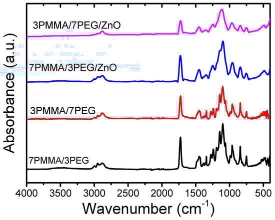 FTIR spectra of the 7PMMA/3PEG and 3PMMA/7PEG polymer blends and of the 7PMMA/3PEG/ZnO and 3PMMA/7PEG/ZnO polymer nanocomposites.
