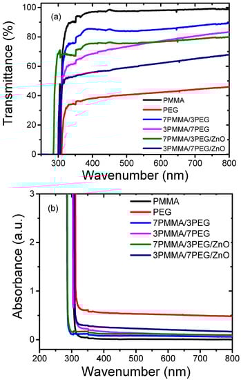 Figure 5a shows the transmittance spectra of PMMA, PEG, 7PMMA/3PEG and 3PMMA/7PEG polymer blends, and 7PMMA/3PEG/ZnO and 3PMMA/7PEG/ZnO nanocomposite films. The UV transmittance of neat PMMA (95%) was higher than that of neat PEG (40%) in the UV range (200–400 nm). The PMMA spectrum showed a strong transmittance increase, with an edge at 380 nm that could be due to the n-π* transition of the carbonyl group in PMMA [41]. A comparison of the PEG and PMMA spectra indicated that PEG provides good protection in the UV range (230–400 nm). For this reason, PEG has been used in the cosmetic industry as a protection against UV radiation [42]. UV absorption was lower by the PMMA-rich blend than by the PEG-rich blend and nanocomposite (Figure 5b). In the 7PMMA/3PEG blend, PEG addition to PMMA resulted in a slight UV transmittance decrease by 8% compared with neat PMMA. Conversely, PMMA addition to PEG (7PMMA/3PEG blend) increased UV transmittance by ~40% compared with neat PEG. This could be explained by the PEG phase’s higher crystallinity degree (Figure 3b).