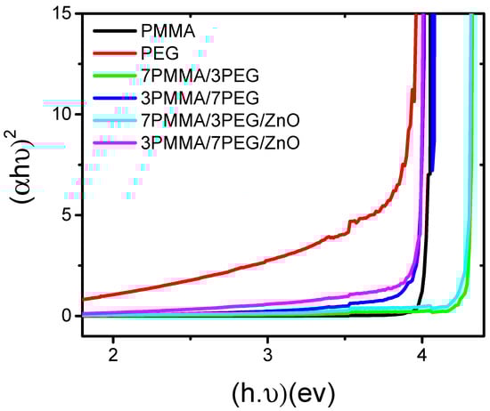 Band gap variation in function of the energy in neat polymers (PMMA and PEG), polymer blends (7PMMA/3PEG and 3PMMA/7PEG) and nanocomposite blends (7PMMA/3PEG/ZnO and 3PMMA/7PEG/ZnO).