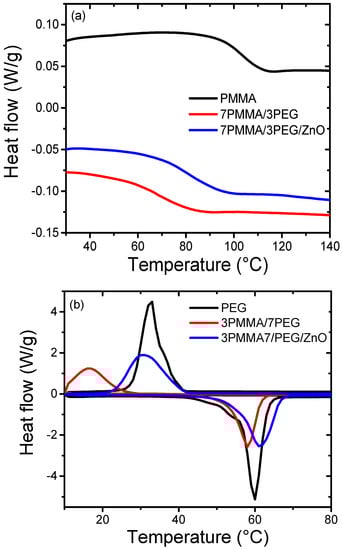DSC curves for (a) neat PMMA, 7PMMA/3PEG and 7PMMA/3PEG/ZnO, and for (b) neat PEG, 3PMMA/7PEG and 3PMMA/7PEG/ZnO.
