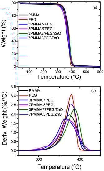 Then, thermal stability was investigated by thermogravimetry and derivative thermogravimetry. The thermogravimetry curves were recorded under nitrogen atmosphere (Figure 8a). Polymer blends are usually degraded in three loss stages [50]: (1) water evaporation at ~60–150 °C; (2) at ~250 °C, thermal decomposition of the functional group CO and C=O in the polymer backbones [51]; and (3) at 300–400 °C, thermal decomposition of PEG and PMMA [52]. Analysis of the decomposition temperature corresponding to 10%, 50% and maximum weight loss (T10%, T50% and Tmax) of the samples (Table 4) showed that the T10% values of the 7PMMA/3PEG and 3PMMA/7PEG/ZnO blends increased from 326° to 352 °C and from 318° to 344 °C, respectively, upon ZnO NP addition. Above 450 °C, the pure polymers and blends were completely degraded and ZnO NPs remained as char. Measurement of the char percentage indicated that ZnO NPs represented only 2% of the total mass of the nanocomposite blends, confirming the EDX results (Table 2). Comparison of the derivative thermogravimetry curves (Figure 8b) showed that ZnO NP addition to the 7PMMA/3PEG and 3PMMA7PEG blends increased the nanocomposite stability and, thus, the Tmax increased from 359 °C to 381 °C (7PMMA/PEG/ZnO blend) and from 361 °C to 386 °C (3PMMA/7PEG/ZnO blend). This effect may be explained by the fact that the added ZnO NPs act as radical scavengers that hinder the chain cleavage and radical formation, and, thus, thermal degradation starts at higher temperatures [53].