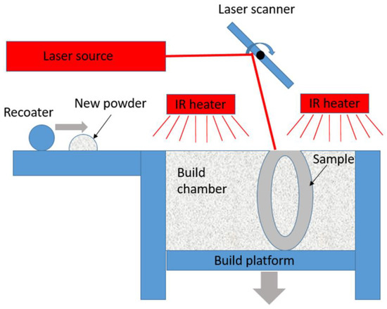 The system used for SLS was a Formiga P110 with a building chamber of 200 × 250 × 330 mm3; in size (EOS GmbH, Krailing, Germany), equipped with a 30 W CO2 laser (spot size of the galvo scanner at focal position is 0.25 mm). The system allows for a build rate of up to 20 mm height/hour with the layer thickness being variable between 0.06 mm and 0.12 mm. To prevent oxidation processes, the build chamber is flooded with nitrogen as a protective gas. A built-in 4-channel infrared heater (IR), monitored by a pyrometer, ensures a controlled temperature in the process chamber. The temperature in the process chamber is just below the melting point of the material used. Thus, thermal distortion can be reduced during manufacturing.