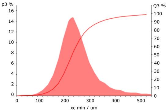 To evaluate the solid–liquid filter characteristics of the 3D-printed manta ray wing and spoiler structures, we used sand added to water (20 g, 100 g). The particle size distribution of such aqueous sand solutions is depicted in Figure 2, and was analyzed by a CAMSIZER X2 based on dynamic digital image analysis methods according to ISO 13322-2 (Retsch Technology GmbH, Haan, Germany). The quantiles of the particle distribution were determined to 166 μm (10% quantile), 233 μm (50% quantile), and 343 μm (90% quantile), respectively.