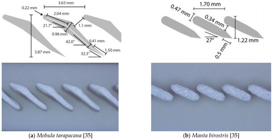 Combining physical modeling of fluid dynamics, Divi et al. [35] showed that manta rays use a unique solid–fluid separation mechanism in which direct interception of particles with wing-like structures causes particles to ricochet away from the filter pores. This filtration mechanism separates particles smaller than the pore size (which in turn can exhibit larger pore sizes), allows high flow rates (high Reynold numbers), and resists clogging. In addition, a three-dimensional (3D)-printed model of an array of filter lobes was manufactured based on anatomical parameters using color jet printing and UV curable resin, with a filtration efficiency for 1D structures being measured in the range between 19% and 62% depending on the filter lobes’ orientations. In particular, precipitator efficiencies of 19% for the “wing” and 62% for the “spoiler” were documented [35].