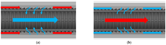 The flow path in the cylindrical filter is shown in Figure 6. In normal operation (Figure 6a), the unfiltered water flows in the outer area of the filter and also leaves the filter in the outer area. Thus, the filter operates in the spoiler mode. The filtered water flows through the filter into the inner area and leaves the structure through the inner exit. The filter can also be used in the inverted mode (Figure 6b), where the unfiltered water is supplied in the inner area, and the filtered water leaves via the outer exit.