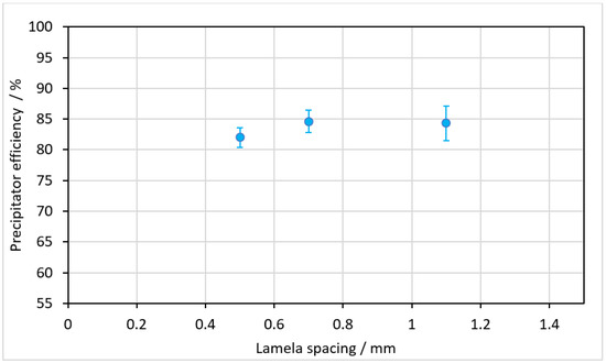 According to the simulations of Ref. [35], a reduction of the lamella spacing with otherwise unchanged flow conditions will not result in an improvement of the filtration effect. We therefore altered the lamella spacing of the mobula spoiler geometry between 1.1 mm and 0.5 mm, resulting in a reduction of the gap size. Please note that a lamella spacing of 1.1 mm was used in the previous measurements. The measured precipitator efficiency for different lamella spacing is depicted in Figure 7. The results revealed that by reducing the lamella spacing, no improvement in the filtration effect was achieved as compared to the initial arrangement. This is in accordance with the results of Divi et al. [35], i.e., the filter effect was based on the dynamic flow of particles and water and not like a mechanical filter at the gap of the lamellae. Please note that the difference between the precipitator efficiency in Figure 7 and in Table 1 is attributed to a chanced cleaning procedure between subsequent experimental tests in both test series.