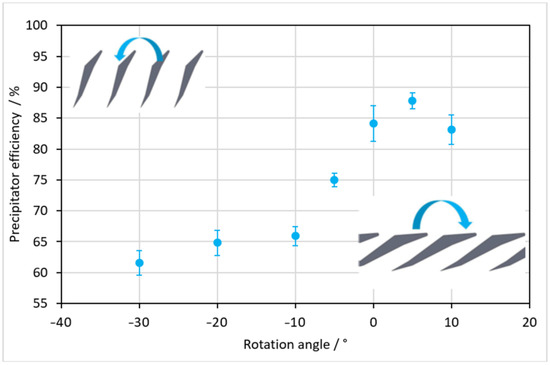 A maximum rotation of +10° in the positive direction was chosen, since at larger angles, the rebound edge would run horizontally to the flow and would therefore no longer show any influence. A minimum angle of −30° in the negative rotation direction was chosen because with higher rotation, the rebound edge would be perpendicular to the flow direction. The filtration effect as a function of the lamella rotation is shown in Figure 8. A continuous increase in the filtration effect was observed between rotation angles of −30° and +5°. This means that a steeper orientation of the structure to the flow would lead to a deterioration of the filtration effect. At an angle of +5° the precipitator efficiency would peak, being higher compared to the standard orientation. As a consequence, with a rotation angle of +5°, the filter would be improved slightly, so this angle was used in the subsequent experiments. With a further increase of the angle, the filtration effect dropped again, which confirmed the theory of the rebound trajectories of the particle being too flat, which reduced the filtration effect.