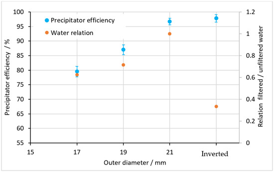 Similar to the afore-presented results, for the fully cylindrical filter geometry (Figure 5) inserted to a tube, the precipitator efficiency was also determined. In addition, the ratio between filtered and unfiltered water was measured. To optimize the round filter structure, the outer diameter of the cylindrical filter was varied at 17 mm, 19 mm, and 21 mm. At the same time, the inner diameter of the surrounding PMMA tube was kept constant at 24 mm. This resulted in a reduction of the gap between the outer diameter of the filter and the inner diameter of the tube as the filter diameter increased (see Figure 5). In a further examination, the filter structure was used in the inverted operation mode according to Figure 6b.