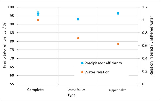 To determine the influence of the filter length, the original filter length of 87 mm was halved to 43.5 mm. In the test setup, the upper or the lower halves of the original filter length were designed as the filter area, while the other half was closed off. The results shown in Figure 10 revealed that a reduction of the filter length led to no significant variation of the precipitator efficiency. Simultaneously, the ratio of unfiltered to filtered water increased, which is disadvantageous. As a consequence, in order to build a small filter, the length can be reduced with unaltered precipitator efficiency but there would be a disadvantageous ratio between unfiltered and filtered water.