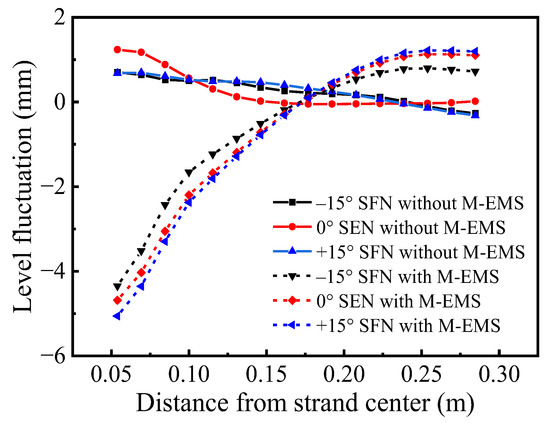 - When the M-EMS direction is opposite to the SFN direction, the tangential velocity and the level fluctuation of the meniscus can be reduced. When the M-EMS direction is the same as the SFN direction, the level fluctuation increases, which easily produces slag entrapment.