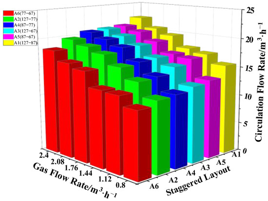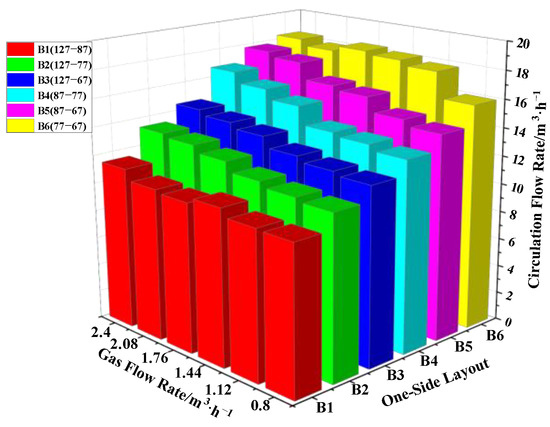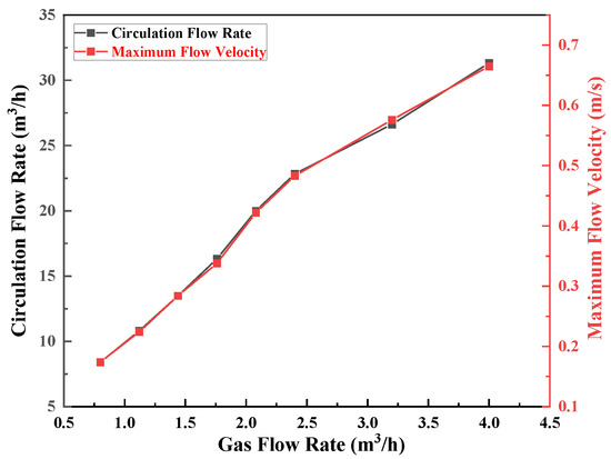 - The circulating flow rate increased as the gas flow rate increased, where the critical value of the gas flow rate was 2.4 m3/h.
