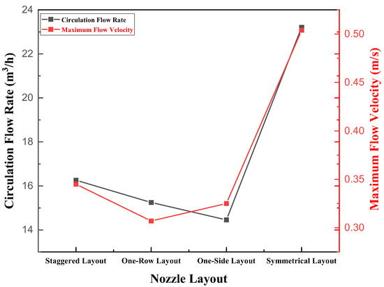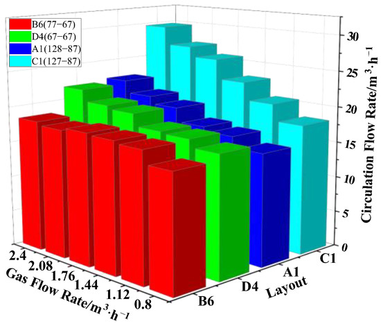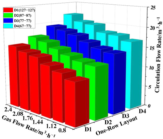- When the nozzle layout was using the one-side layout and the one-row layout, the main factor for improving the circulating flow rate was the working stroke of the bubbles. When nozzles were using the staggered layout and the symmetrical layout, the carrying capacity of bubbles was the main factor for improving the circulating flow rate.